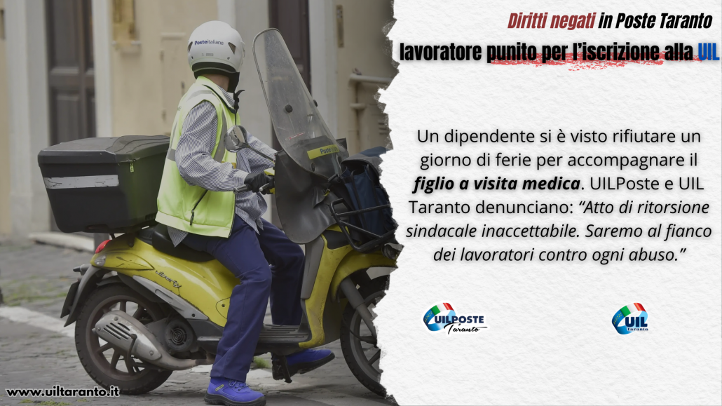 “Questo episodio è solo l’ultimo di una lunga serie di attacchi nei confronti dei lavoratori che si affidano alla nostra organizzazione per difendere i propri diritti,” afferma Gennaro Oliva, coordinatore UIL Taranto. “Siamo vicini al collega colpito e chiediamo a Poste Italiane di intervenire subito per fermare questa deriva autoritaria. La UIL non resterà in silenzio: continueremo a denunciare ogni abuso, sempre dalla parte dei lavoratori.”