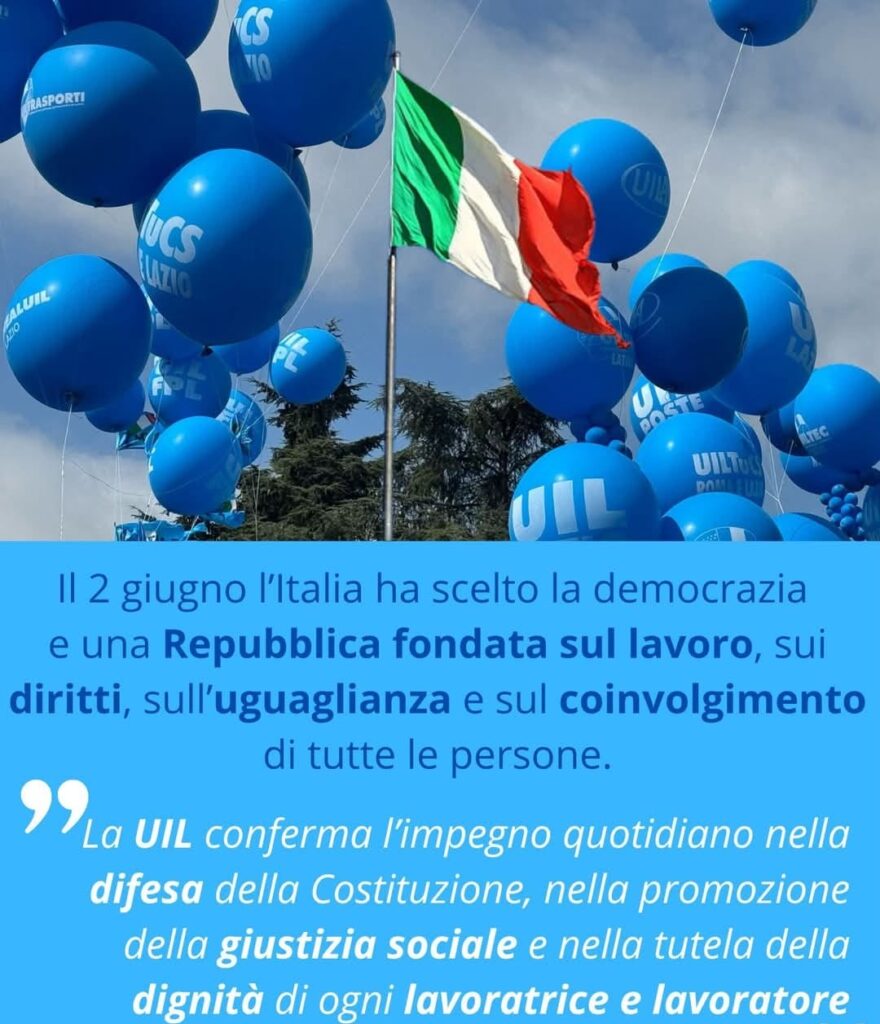 La partecipazione alle celebrazioni del 2 giugno conferma il legame indissolubile tra la UIL e i principi fondativi della Repubblica: lavoro, libertà, pace e giustizia sociale. In un tempo in cui i diritti vengono messi in discussione e il lavoro subisce nuove forme di precarizzazione, la UIL ribadisce il proprio impegno al fianco delle persone, per costruire una società più equa e solidale, nel rispetto dello spirito della Costituzione.