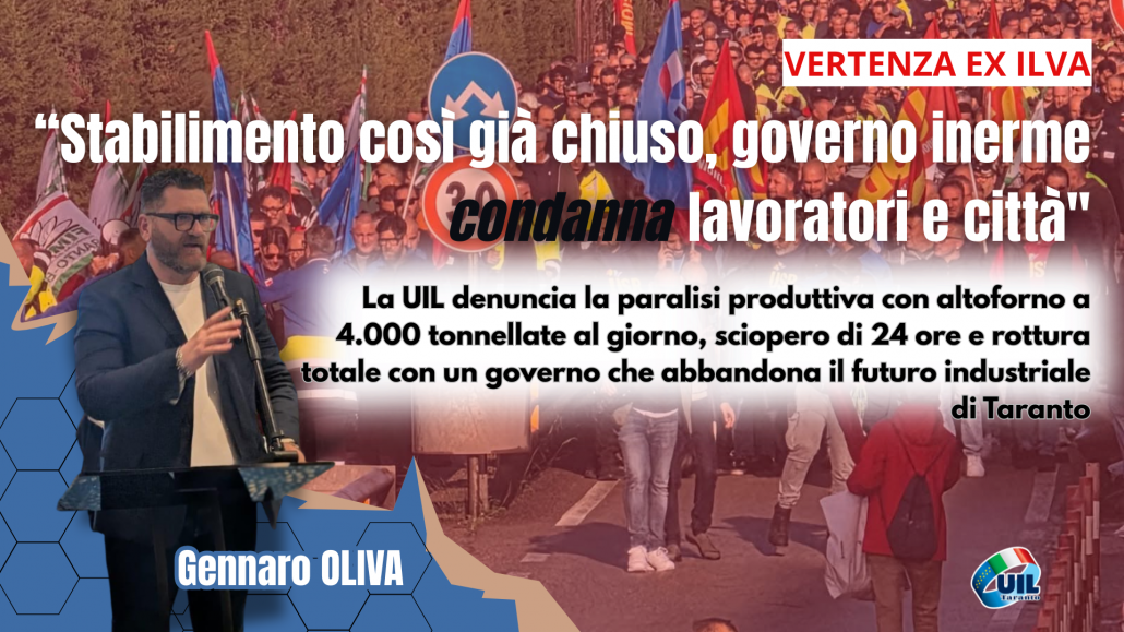 Taranto, 20 novembre 2025 – Il coordinatore della UIL Taranto, Gennaro Oliva, interviene con fermezza sulla situazione dello stabilimento ex Ilva di Taranto, dove stamane si è svolta una mobilitazione con assemblee e la proclamazione di uno sciopero di 24 ore.